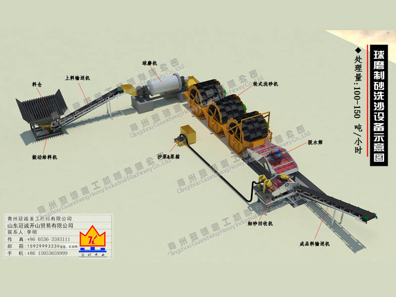 球磨制砂機生產(chǎn)流程:裝載機——大料斗——上料帶——球磨式制砂機——清淤池——挖斗式洗砂機——清淤池——輪斗式洗砂機——出料帶——細(xì)沙回收脫水——成品打堆。