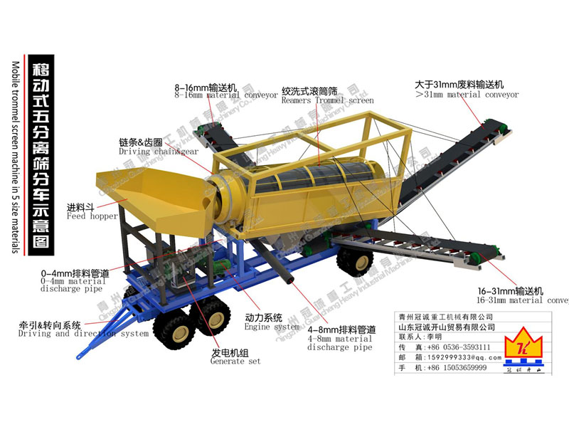移動(dòng)式五分離篩分設(shè)備,發(fā)電機(jī)組集成在底盤上,附帶牽引&轉(zhuǎn)向系統(tǒng),可以使用牽引車輛輕松移動(dòng)至工作場(chǎng)地;其中篩分系統(tǒng)使用了新型核心技術(shù)的絞洗式滾筒篩,其優(yōu)勢(shì)如下: